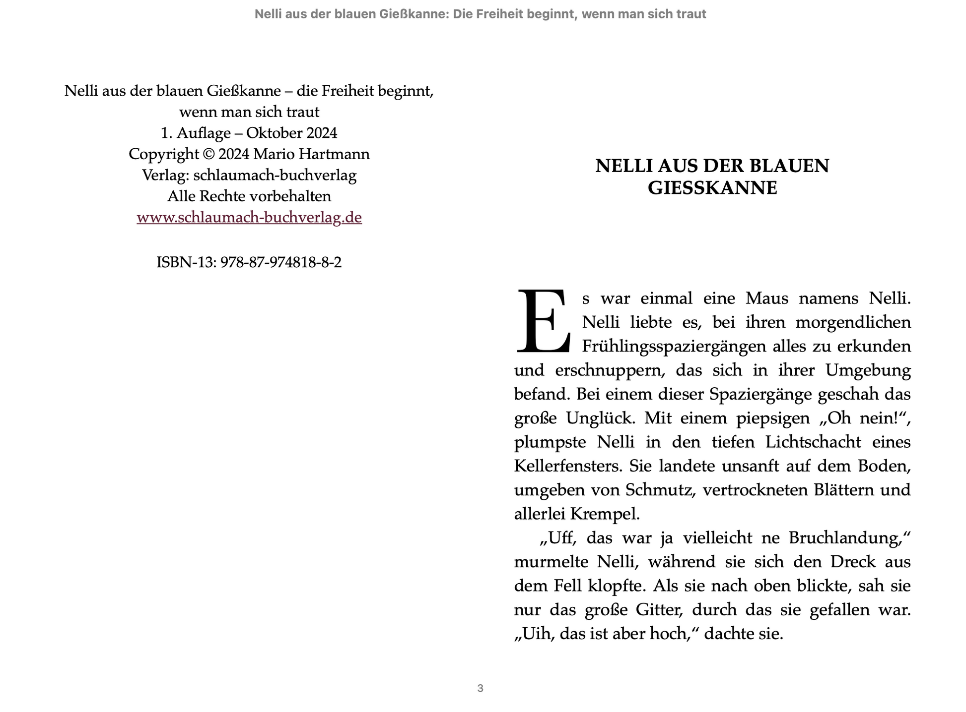 In dieser warmherzigen und lehrreichen Geschichte von Mario Hartmann geht es um Nelli, eine neugierige kleine Maus, die versehentlich in einen dunklen Lichtschacht fällt und sich dort ein neues Zuhause in einer blauen Gießkanne einrichtet.